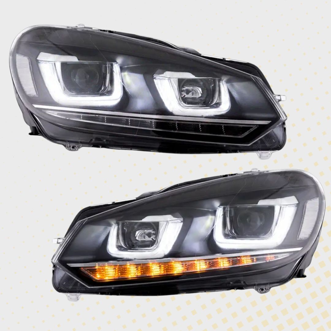 LED dinamički farovi za Volkswagen Golf 6 (2008-2014) dolaze s modernim LED dnevnim svjetlima i dinamičkim pokazivačima smjera. Crna unutrašnjost svjetala s kromiranim detaljima daje vozilu agresivan i sportski izgled. Opremljeni su H7 dugim svjetlima i D2H kratkim svjetlima te omogućuju jednostavnu montažu na originalnim lokacijama. Integrirani su i motori za električno podešavanje visine svjetala, što dodatno olakšava njihovu upotrebu.